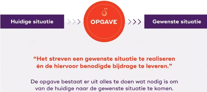 Ook hecht Igno eraan dat een zuiver onderscheid wordt gemaakt tussen een ‘doel’ of ‘bedoeling’ en een ‘opgave’. Het gezamenlijke en maatschappelijke doel dat we willen realiseren, beschrijft de gewenste situatie. Maar in zichzelf zet een doel niet aan tot actie. Pas wanneer de huidige situatie op basis van feiten en cijfers tegenover de gewenste situatie wordt gezet, en er een verschil zichtbaar wordt, wordt de opgave duidelijk. Dan weten we immers wat de te overbruggen afstand is, welke moeite dit gaat kosten en welke middelen en randvoorwaarden daarvoor nodig zijn. Bovendien is het bij opgavengestuurd werken essentieel dat alle betrokkenen bereid zijn om te doen wat nodig is om de opgave te realiseren. Voorbij hun eigen belangen en organisaties. Anders gebeurt er nog steeds onvoldoende.