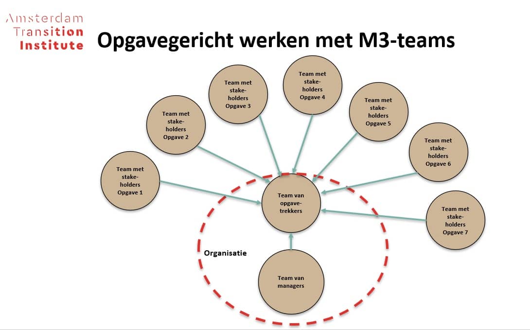 In de tweede afbeelding is het anders georganiseerd. De opgavetrekkers vormen een gezamenlijk team waarin ze afstemmen in plaats van individueel druk te gaan geven (M3). Datzelfde geldt voor het managementteam en de opgaveteams. Door de verbindingen die er gelegd worden tussen de opgaven en de staande lijnorganisatie, komt er meer samenhang en gaan alle betrokkenen die ook steeds meer zien.