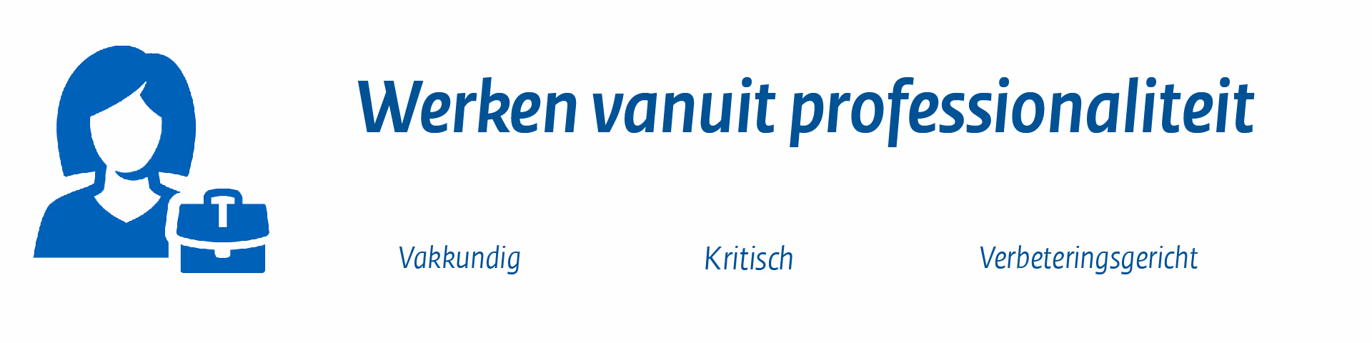Bij dit principe horen de waarden 'vakkundig', 'kritisch' en 'verbeteringsgericht'. Scroll naar beneden voor uitleg bij de waarden, inspiratie en voorbeelden. Wat betekenen ze voor jou in je dagelijkse werk?
